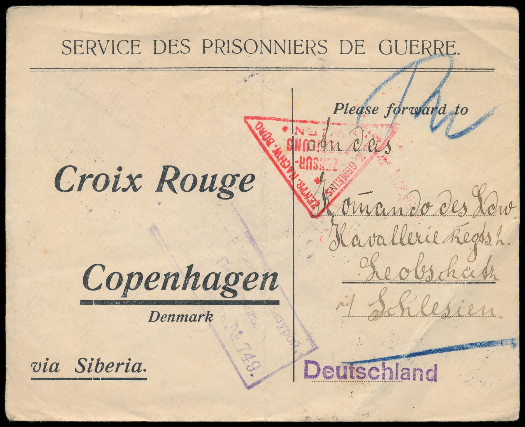 Hung Hsien-Periode (Herrschaft von "Kaiser" Yuan Shikai) Januar bis 22. März 1916: seltener Stempel D Tientsin mit chinesischer Datierung "Jahr 1" rückseitig auf portofreiem Kriegsgefangenen-Vordruckumschlag über Rote Kreuz in Kopenhagen nach Österreich, rückseitig weitere Durchgangsstempel von Tientsin 13.3.16, Bahnpost Peking - Moukden 14.3.16 und Harbin 15.3.16, undeutlicher russischer Zensurstempel von Petrograd und Zensur Wien