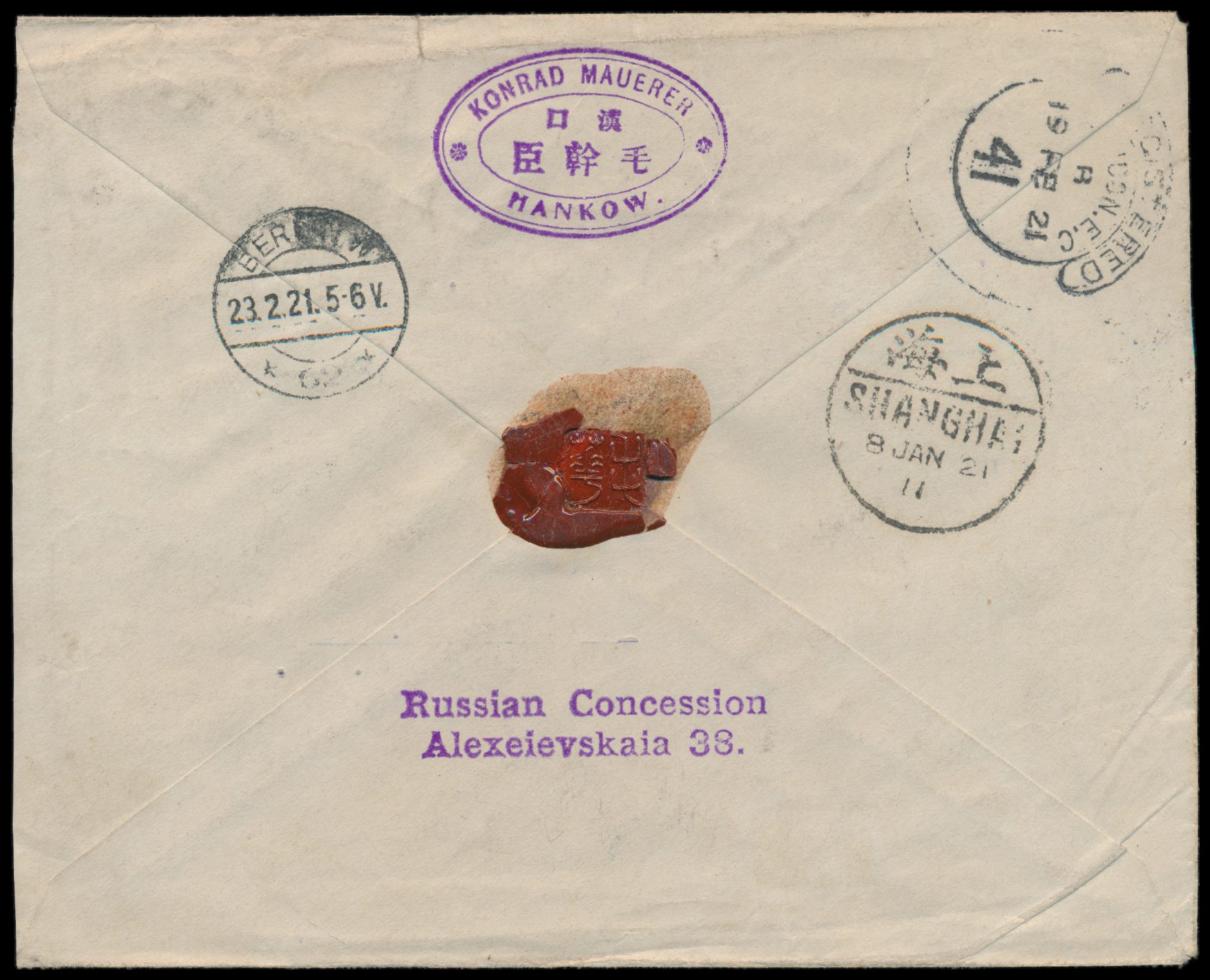 Dschunke 4 C. und 2 x 8 C. auf Einschreibbrief mit Stempel Hankow 4.1.21 via USA nach Deutschland, Absender "Konrad Maurer ... Russian Concession ...", Durchgangsstempel Shanghai 8.1.21 und Registered London 19.2.21, Ankunftstempel Berlin 23.2.21, violetter L4 "als Einschreibbrief in Berlin Auslandstelle eingegangen. ..." und R-Zettel Berlin 8 (Ort durchgestrichen), Bedarf