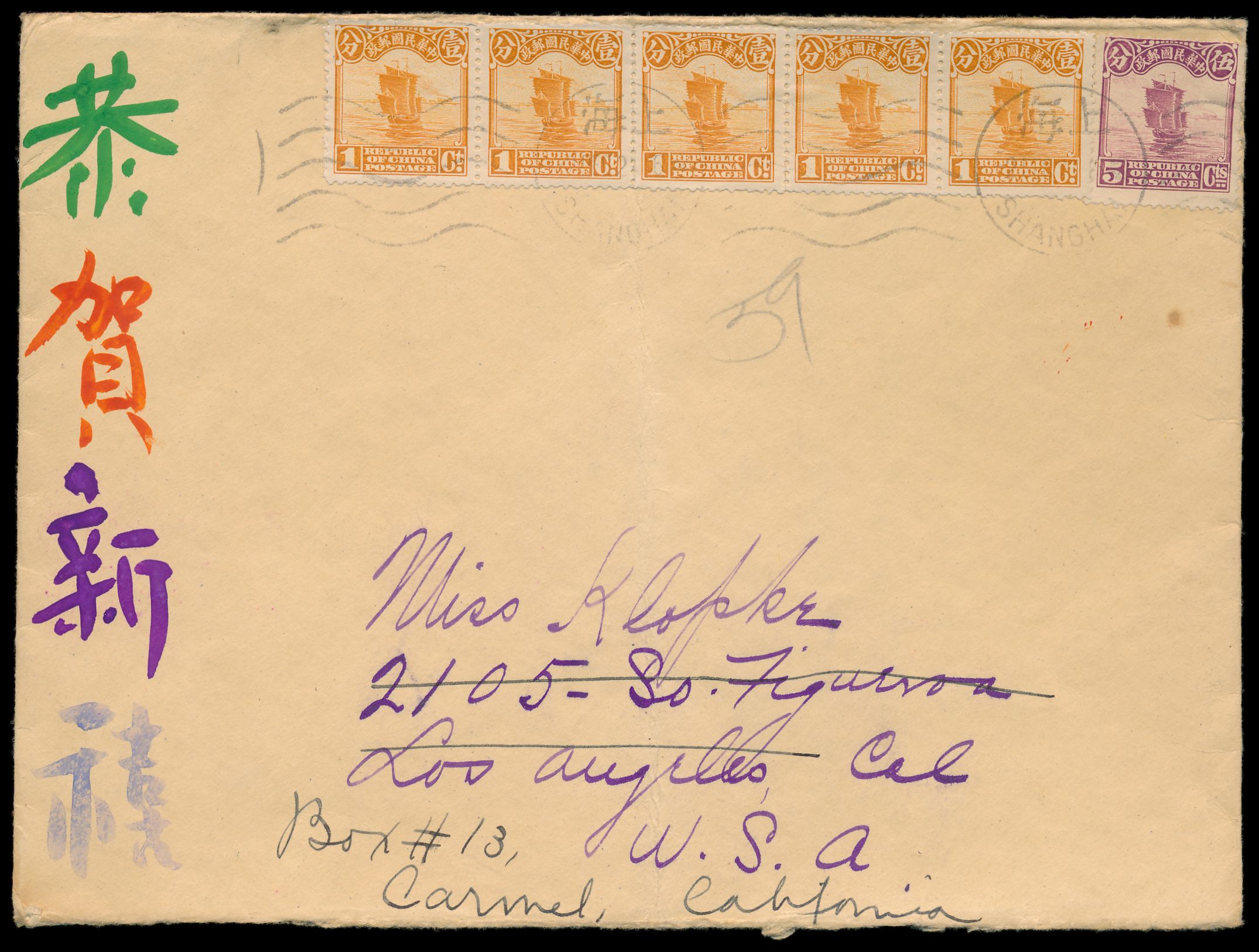 5 x 1 C. und 5 C. Dschunke mit Maschinenstempel Shanghai 2.12.24 auf Brief nach USA, Ankunftstempel Los Angeles 2.1.1925, senkrechter Mittelbug (durch Markenzähnung), Bedarf