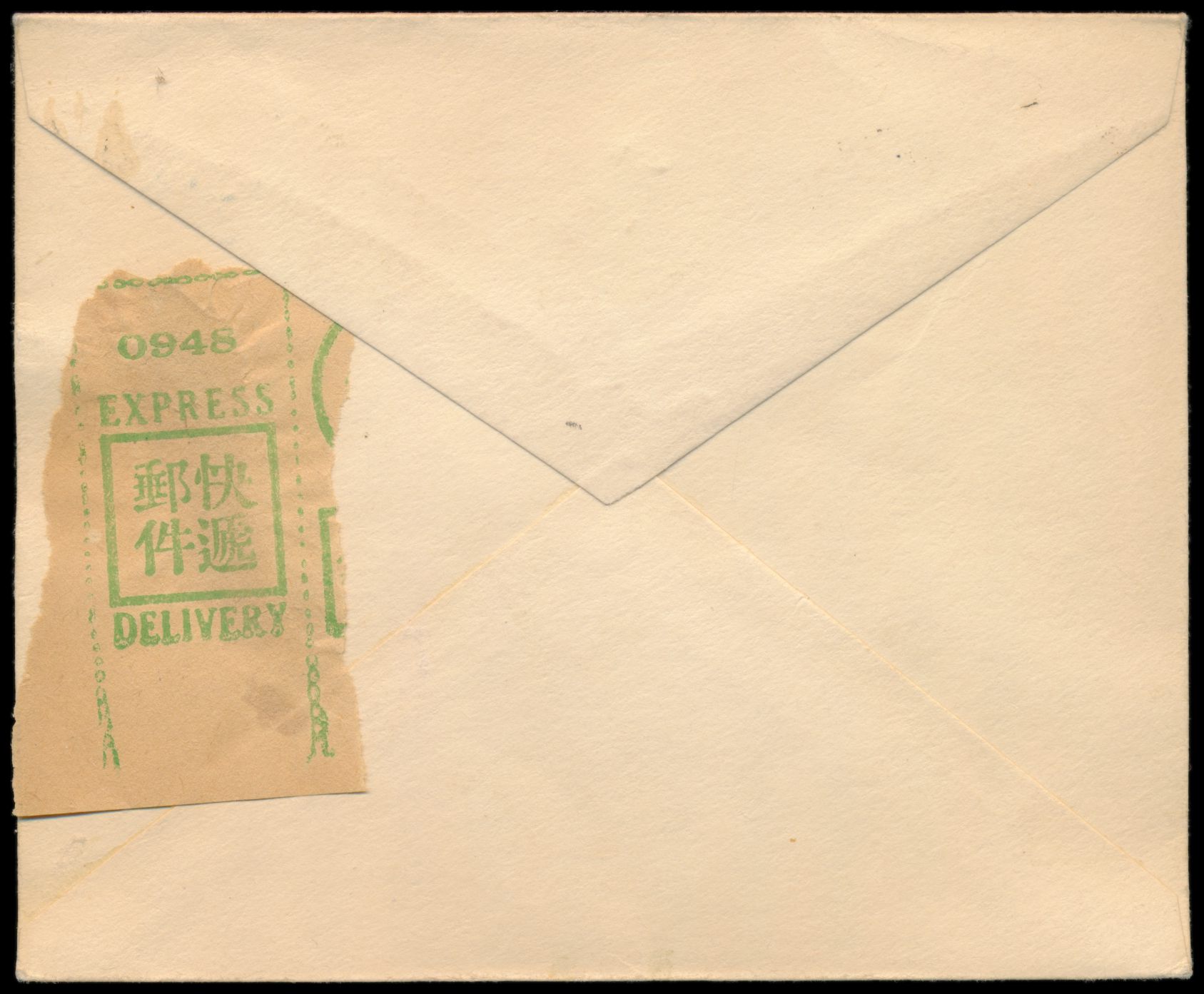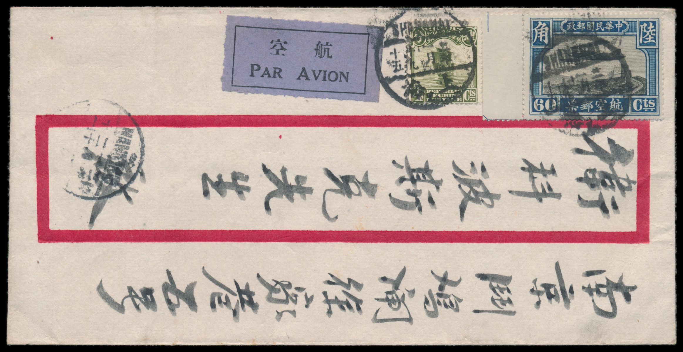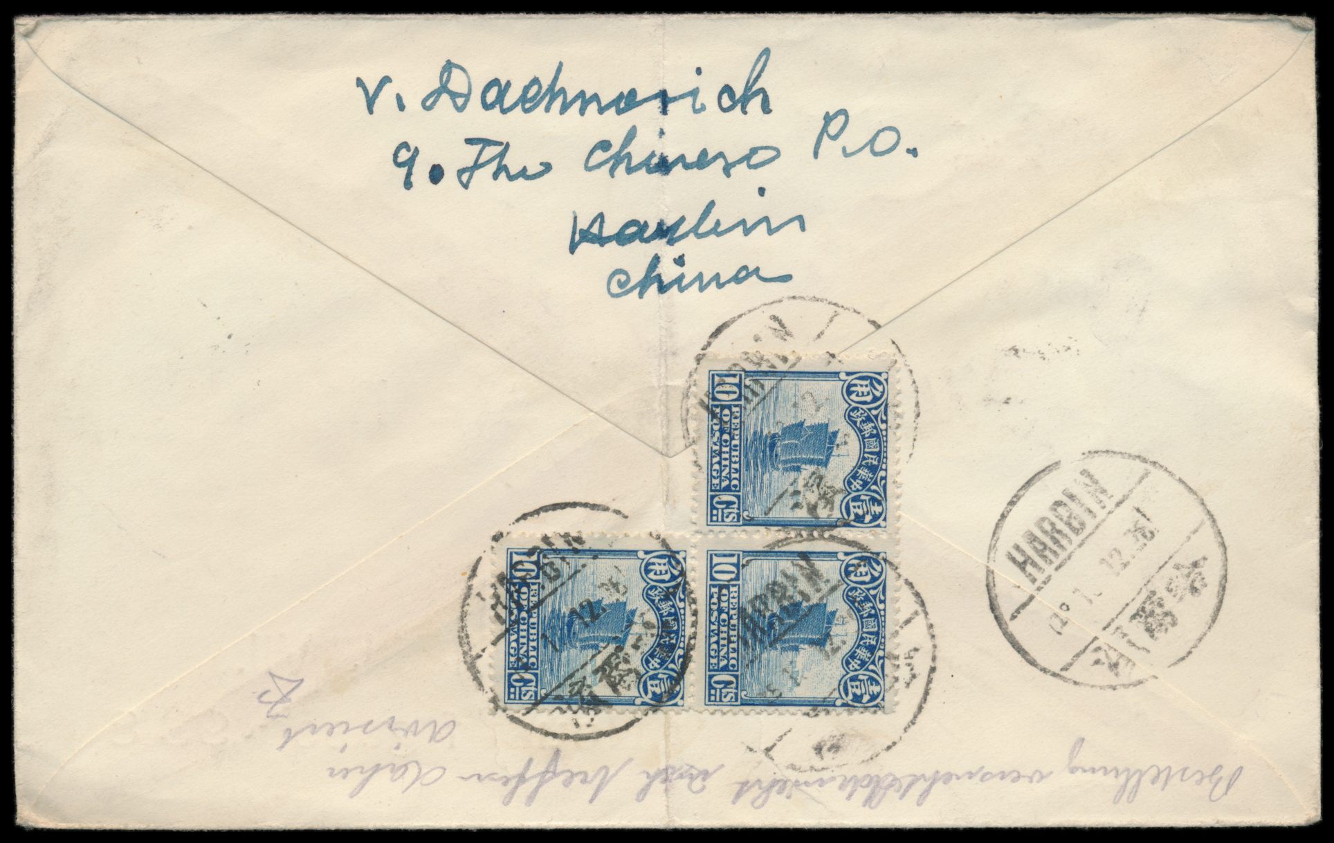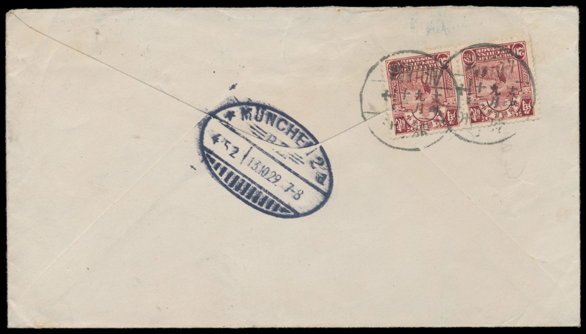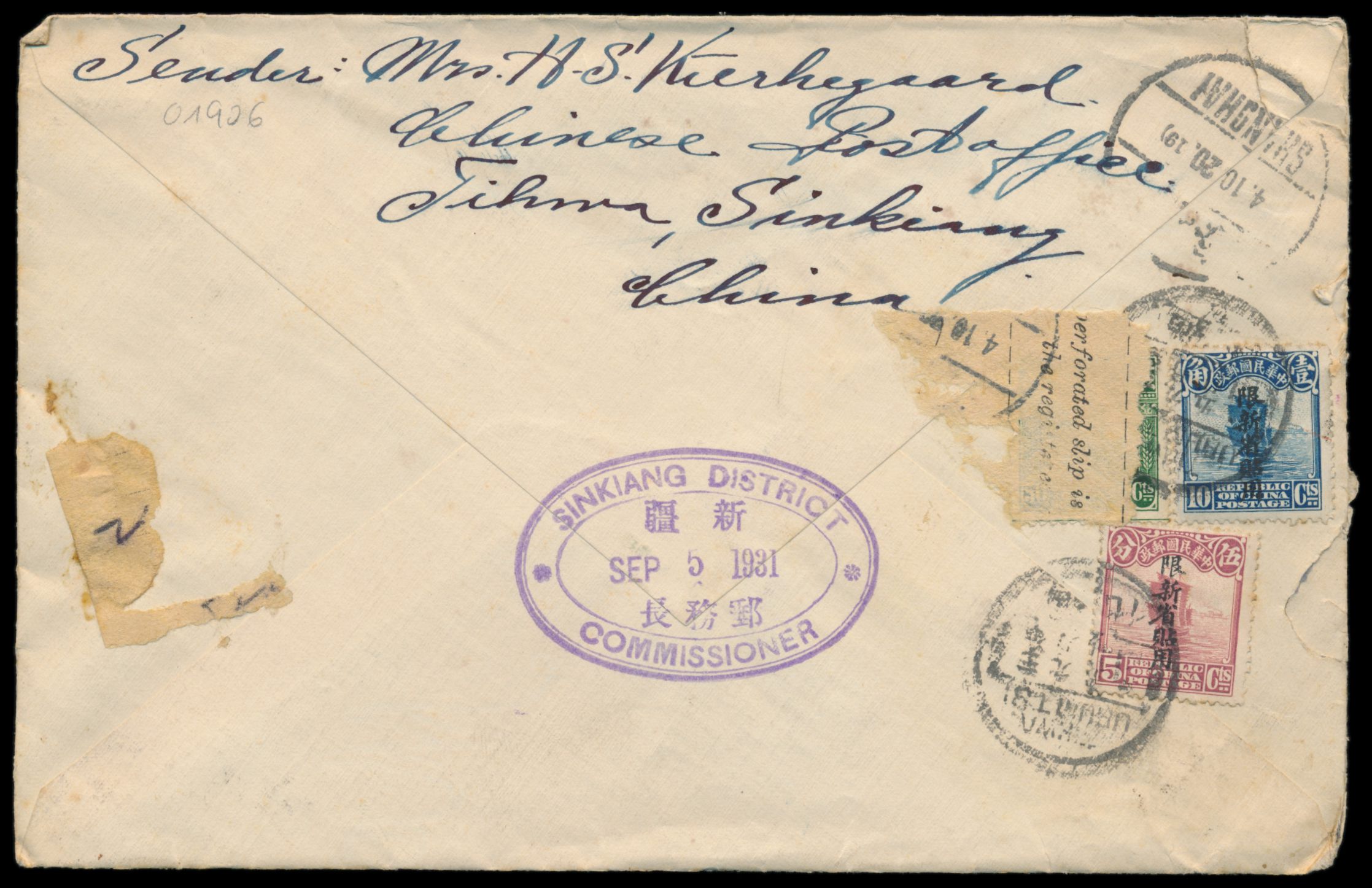 Sinkiang, 5 C. und 10 C. Dschunke und 50 C. Reisernte mit Provinzaufdruck rückseitig auf Einschreibbrief mit Stempel Tihwa / Urumtsi nach Shanghai, rückseitig Fragment des chinesischen Registrierzettels, vorderseitig handschriftlicher R-Vermerk und handschriftlicher Leitvermerk "via Sibirien", Ovalstempel Sinkiang District Commissioner 5.9.1931, Ankunftstempel Shanghai 4.10.20 (1931), Bedarf