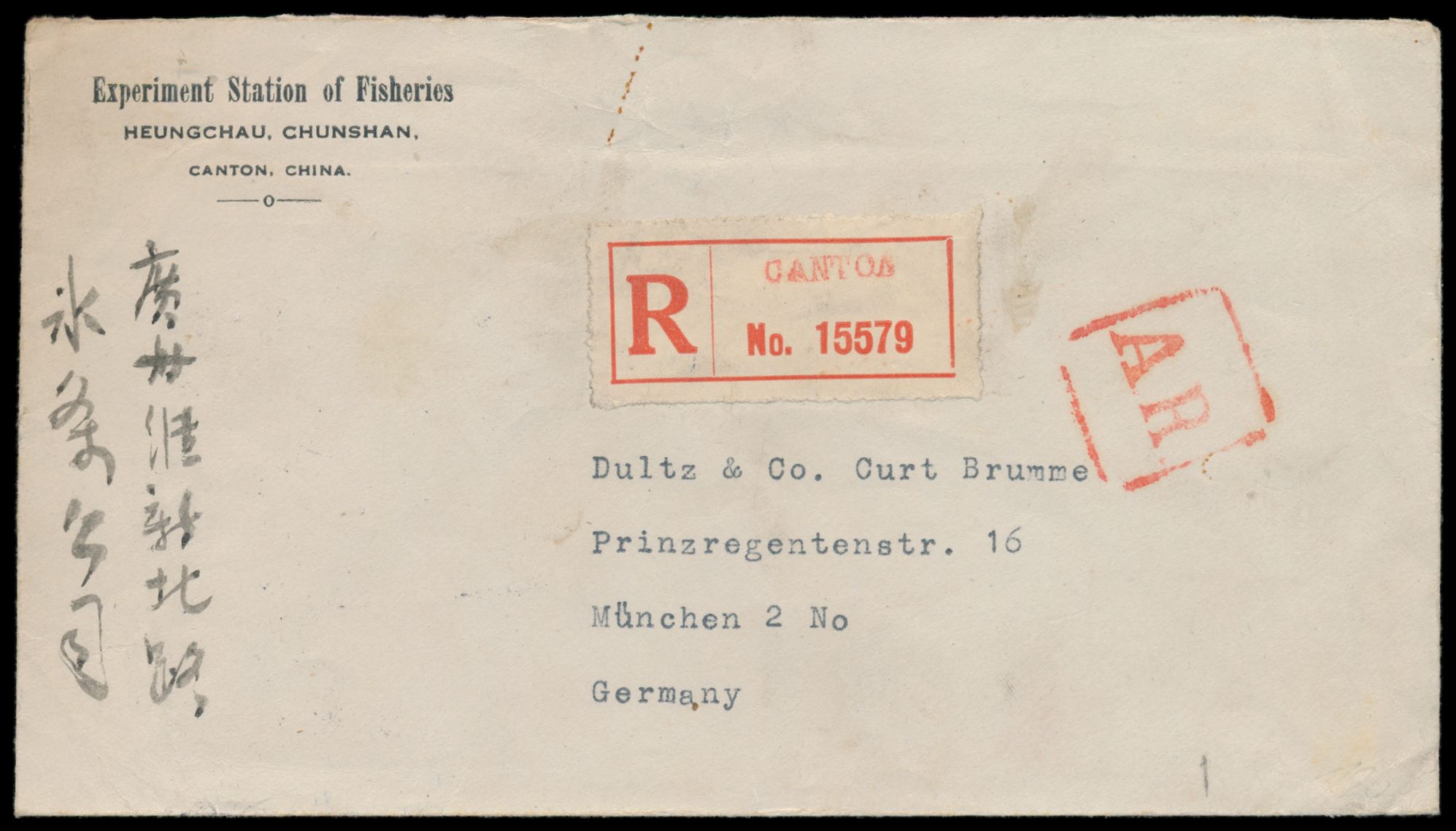 2 x 10 C. Dschunke auf Einschreibbrief der "Siberian American Company" via Russland nach Deutschland, Stempel Harbin 2 16.12.14 (1925) und Blanko-R-Zettel mit schwarzem R1 "Harbin 2", Ankunftstempel Mainz 31.12.25, Bedarf