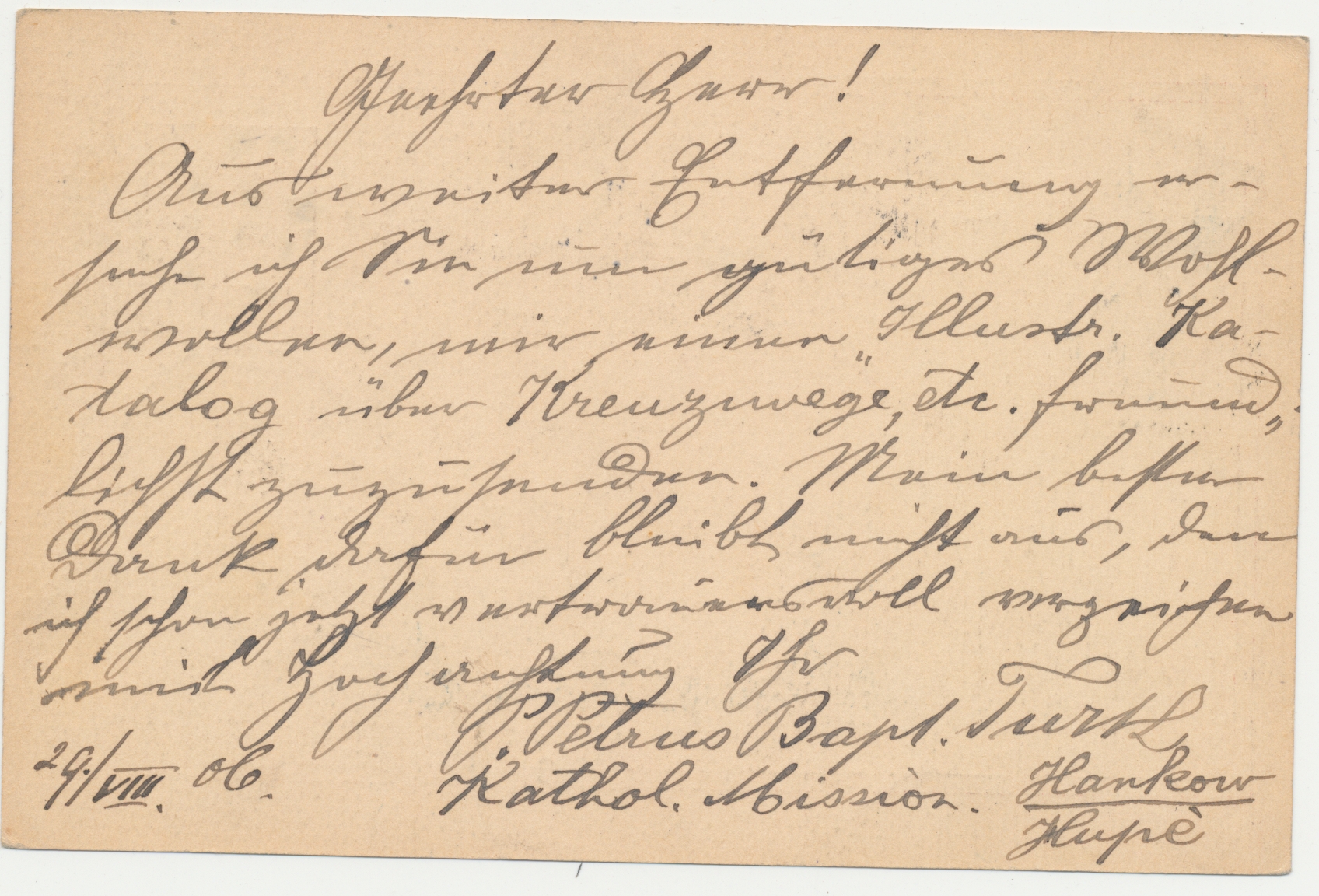 Ganzsache Deutsche Post 10 Pf., geschrieben "Kathol. Mission Hankow" am 29.8.06, befördert durch die chinesische Post, verschiedene Lunar Dater, Taxstempel "T", Durchgangsstempel Shanghai 2.9.06 und 3.9.06 des chinesischen und des britischen Postamts, Bedarf